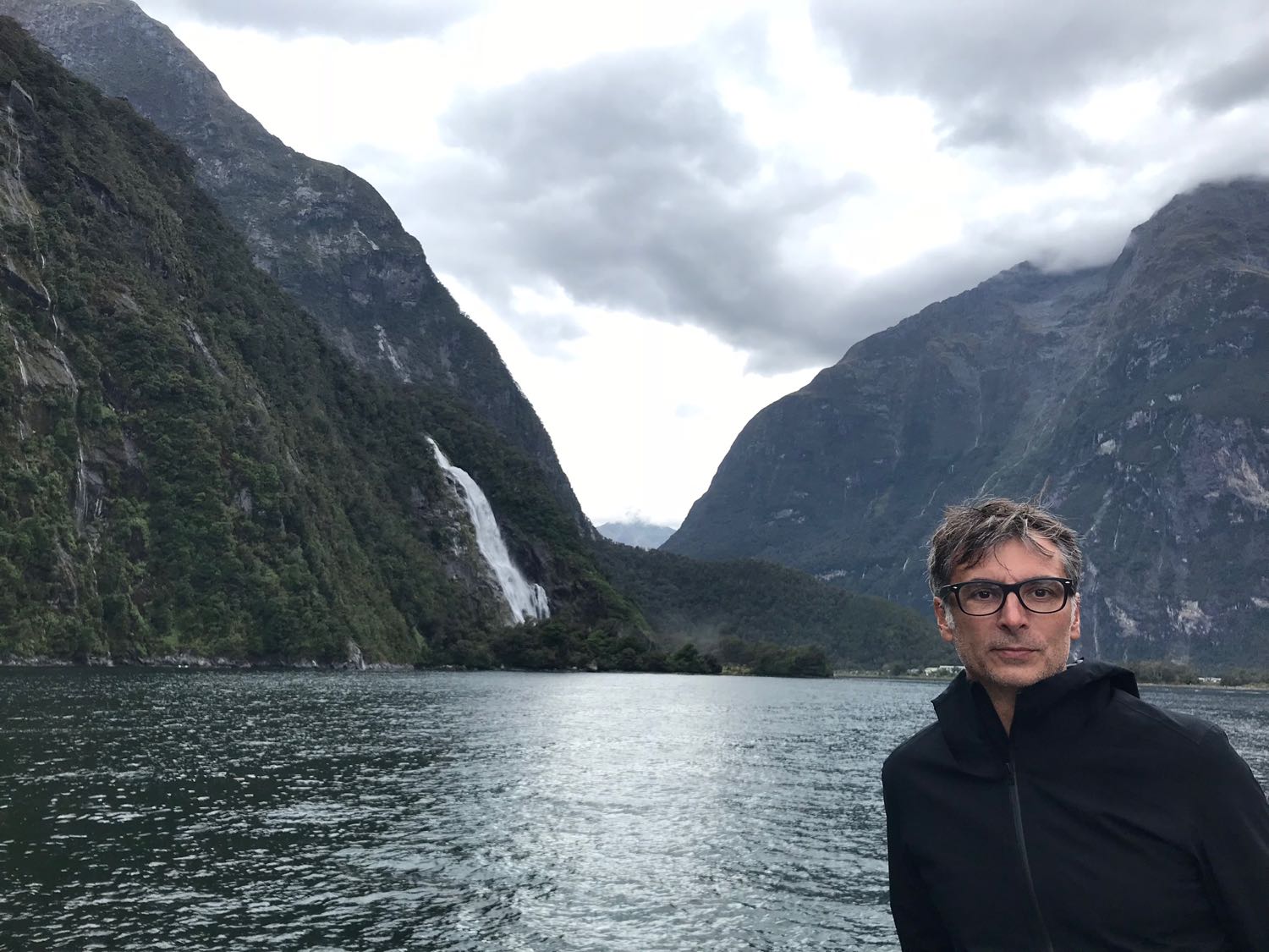 Geoffrey devant Lady Bowen Fall – Milford Sound – Fjordland – Nouvelle-Zélande