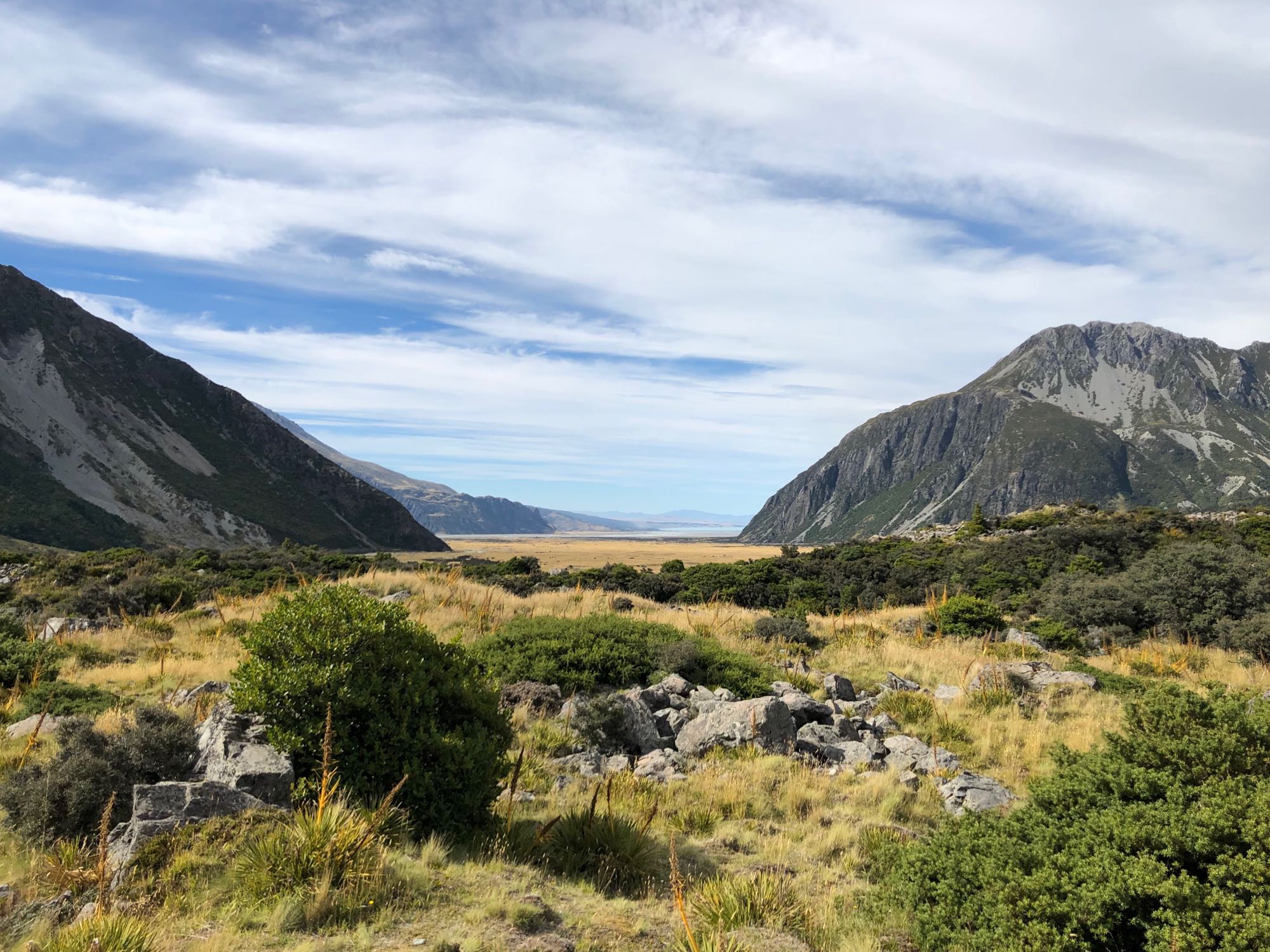 La Hooker valley vue dans le sens opposé aux glaciers – Le lac Pukaki tout au fond – Hooker Valley Track – Mont Cook – Nouvelle-Zélande
